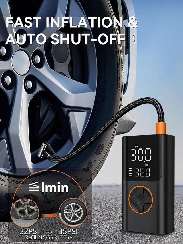 Powerful and Fast Tire Inflator: The AIRSURE tire inflator portable air compressor delivers 150 PSI30% more powerful and 3X faster than standard tire pumps. Quickly solve a sudden flat tire or low pressure. This portable tire inflator for car restores tires in minutes, saving time and ensuring safety