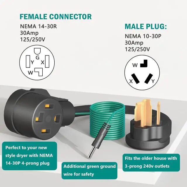 4 Prong to 3 Prong Dryer Plug Adapter with Green Ground Wire, Connects 4-Prong New Dryer Female to 3 Prong Old Dryer Male Receptacle