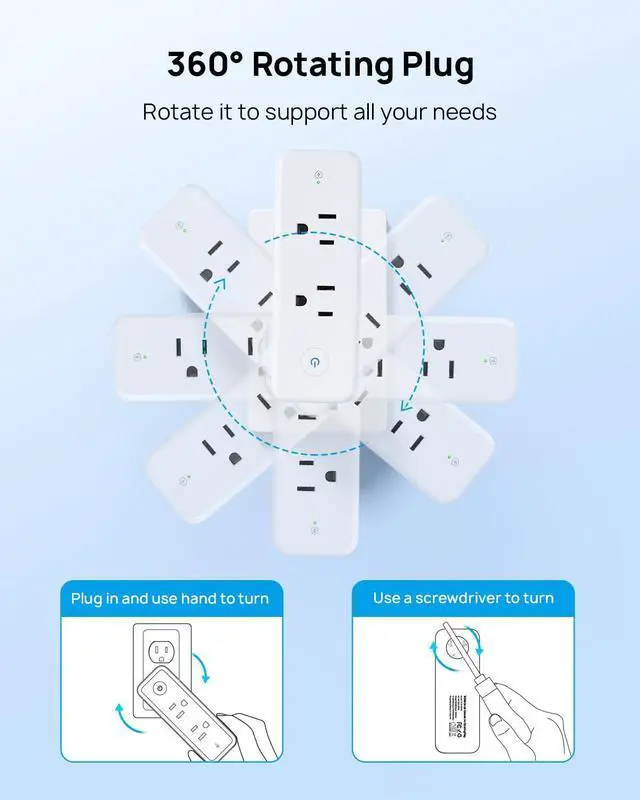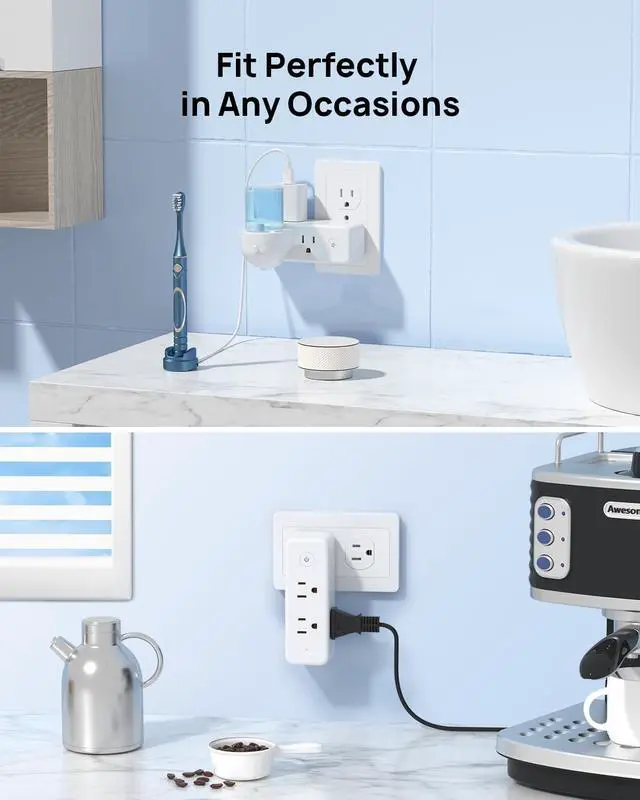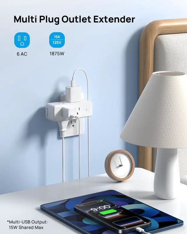 The 3-sided rotatable outlet splitter with 6 wide-spaced AC outlets accommodates larger power adapters without blocking each other.