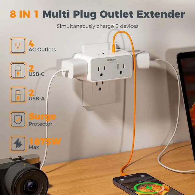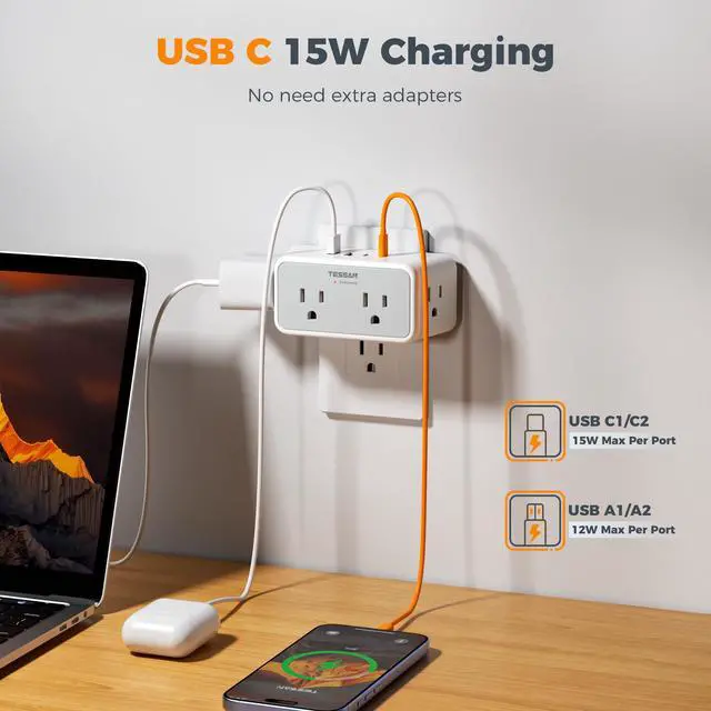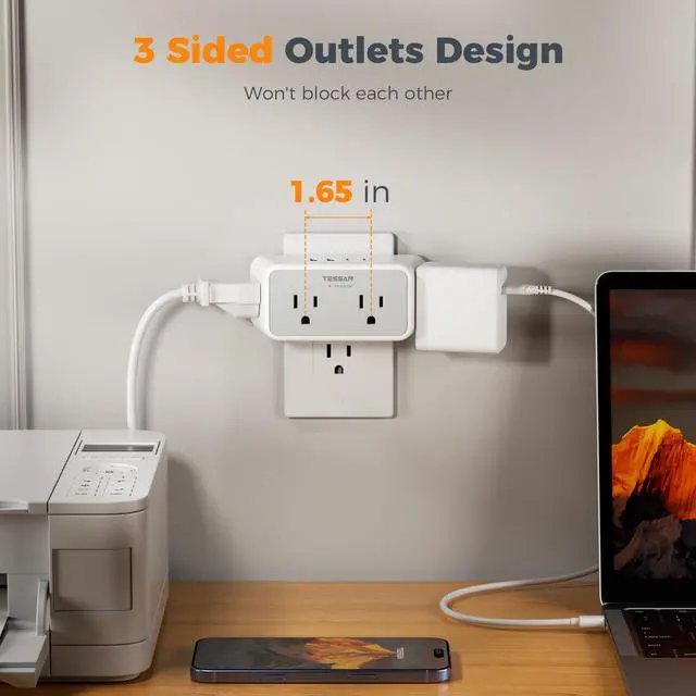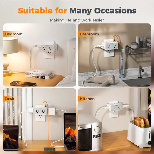 This TESSAN power outlet splitter can be plugged into your wall outlet without blocking other sockets, keeping your space neat and tidy; It has no plastic stake on the back and is easy to rotate angles, so it works with all types of receptacles