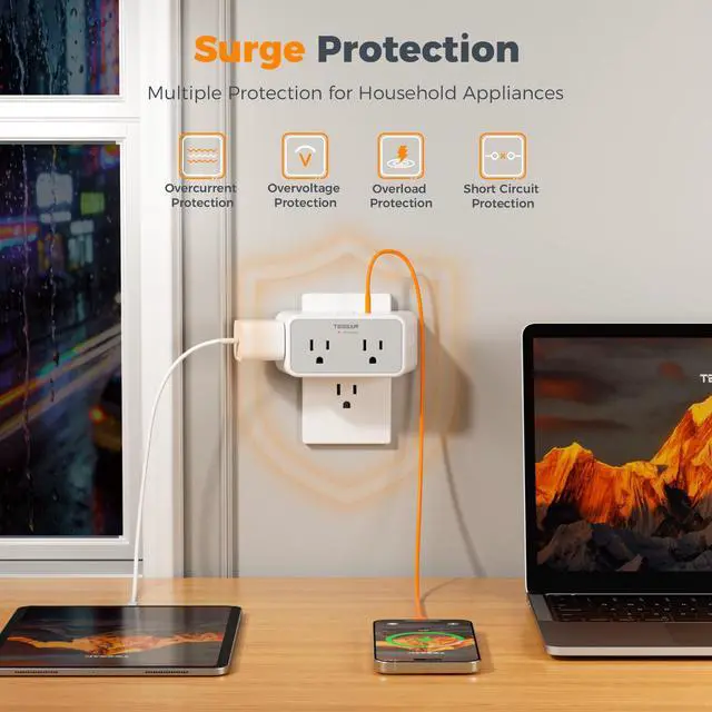 This surge protector with usb ports can protect your computers, tv, and other electronices from power surge attacks that might be caused by the unstable power supply and storm