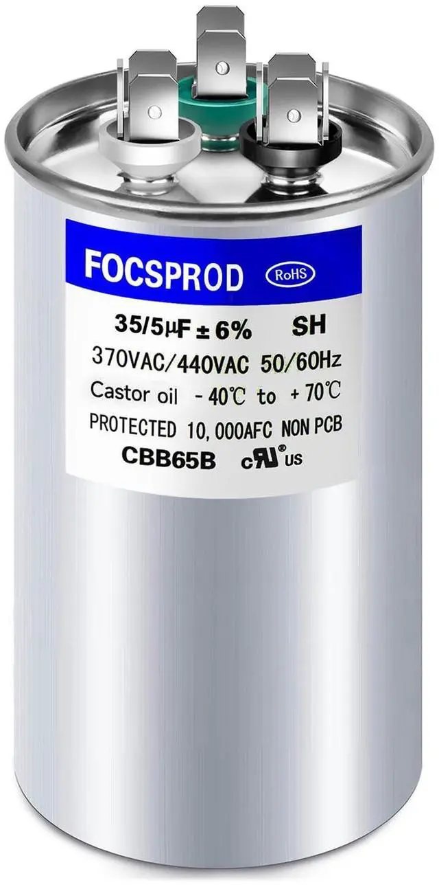 ![Main image of [UL Recognized] FOCSPROD 35+5 uF 35/5 MFD ±6% 370V/440V CBB65 AC Capacitor, Dual Run Round Capacitor Replacement, 35 5 uF 440 Volt HVAC for AC Unit Fan Motor Start or Heat Pump or Condenser Straight](https://c1.neweggimages.com/productimage/nb640/C67GD2604200YGFCVB8.jpg)