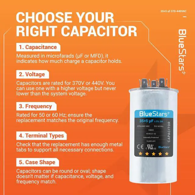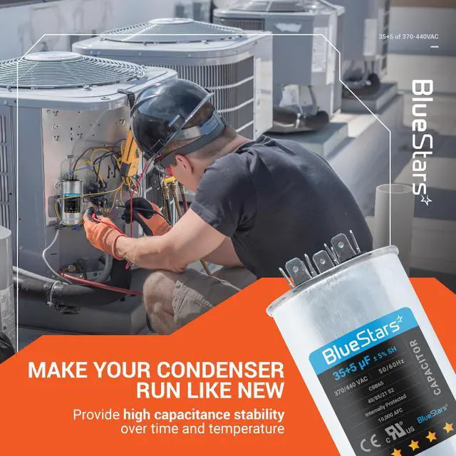 ![Main image of [UL Certified] BlueStars 35+5 uF 35/5 MFD 370-440VAC Dual Run Round Air Conditioner Capacitor - Fits AC Unit Fan Motor Start or Heat Pump or Condenser Straight Cool - Replaces 97F9834 Z97F9834](https://c1.neweggimages.com/productimage/nb640/C67GD2604200YGMY0FC.jpg)