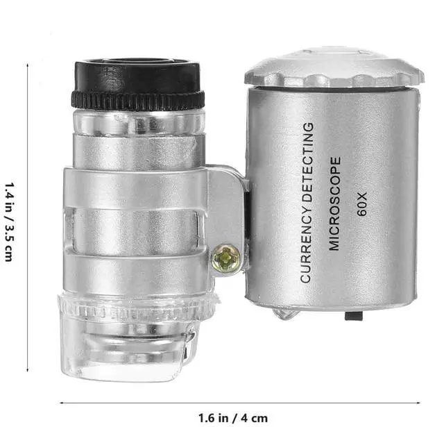 This jewelry identification microscope measures approximately 1.38 x 1.57 x 0.79 inches making it easy to carry and ideal for daily use in examining gemstones and fine details