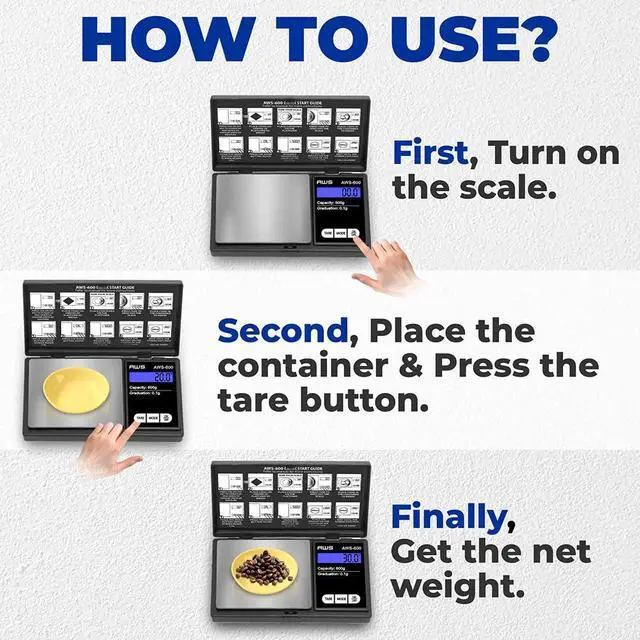 Use Mode button to switch unit modes between grams, ounces, troy ounces, and pennyweights. Use Tare button for quick and easy taring.