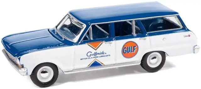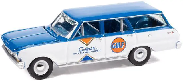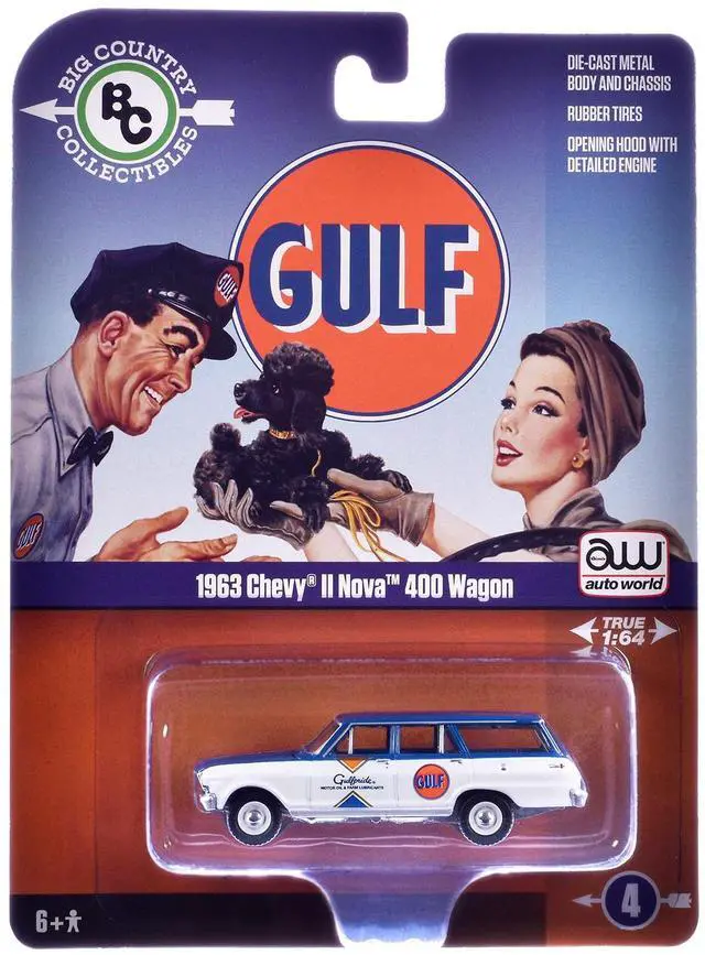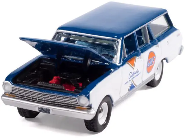 Brand new 1/64 scale diecast car model of 1963 Chevrolet II Nova 400 Wagon "Gulf" Blue and White with Blue Interior "Big Country Collectibles" 2025 Series die cast model car by Auto World.