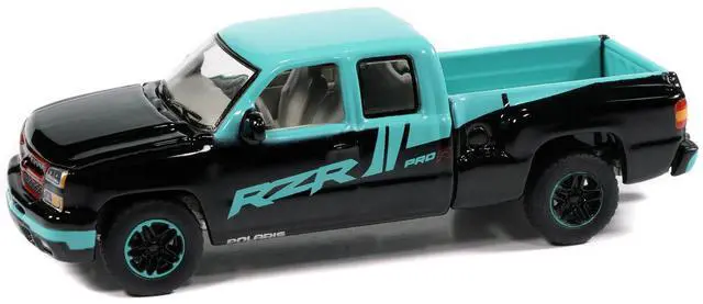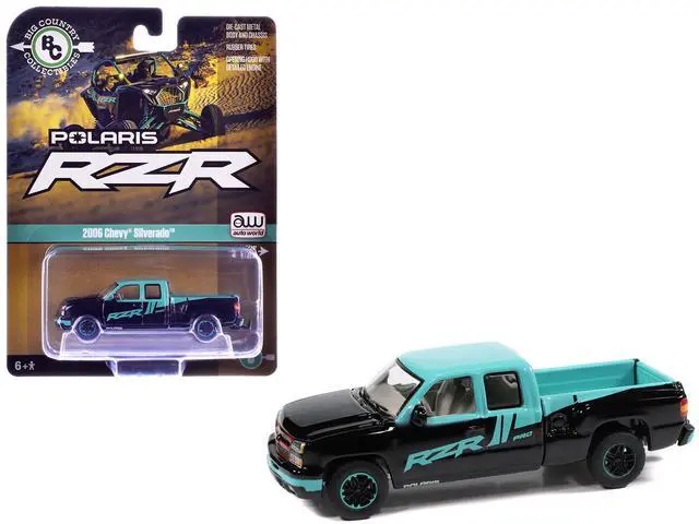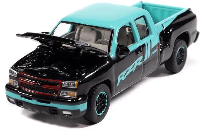 Brand new 1/64 scale diecast car model of 2006 Chevrolet Silverado Pickup Truck "Polaris RZR" Black and Blue "Big Country Collectibles" 2025 Series die cast model car by Auto World.