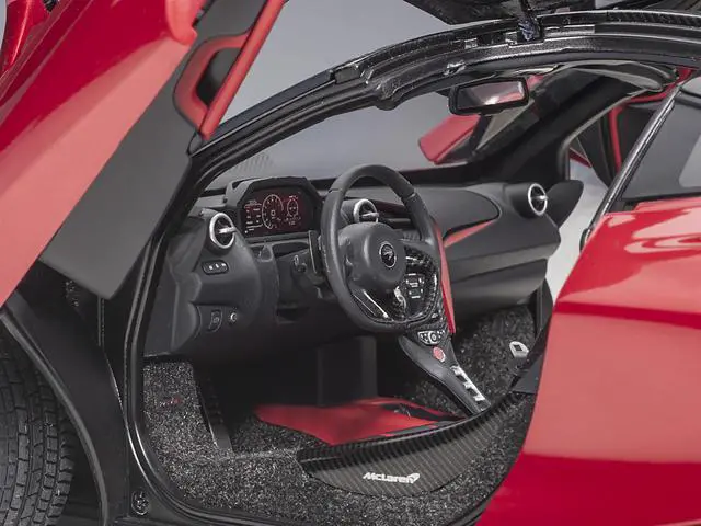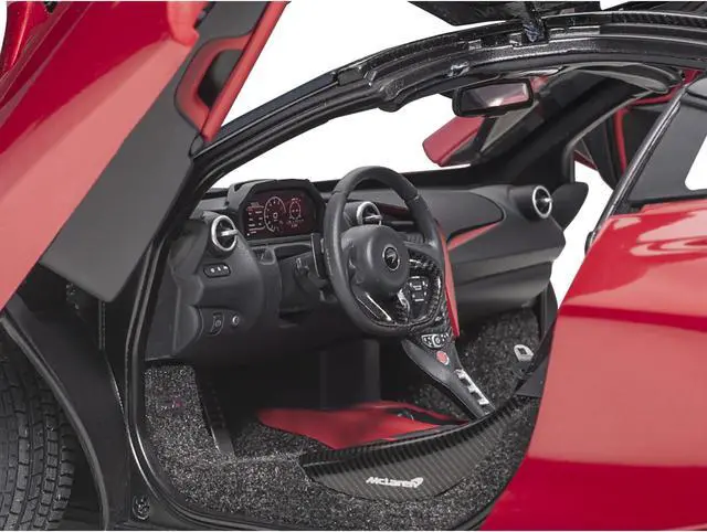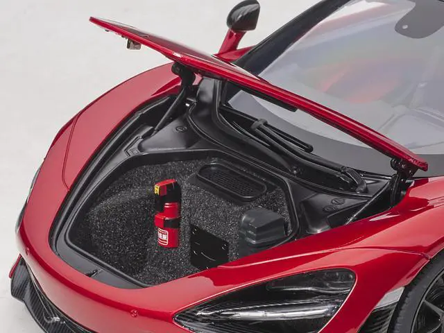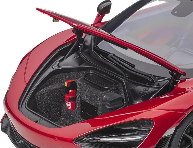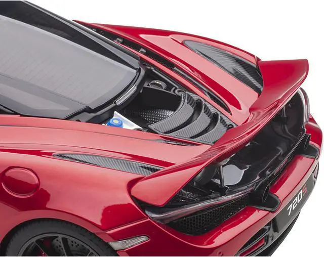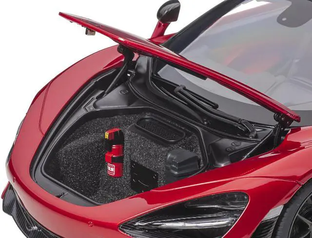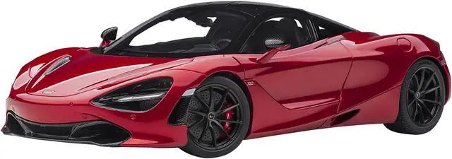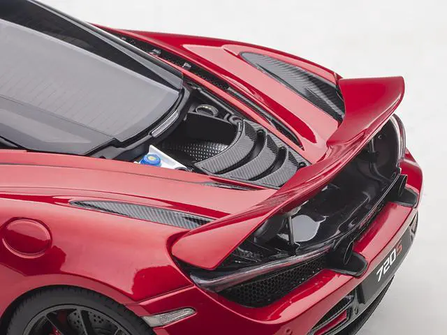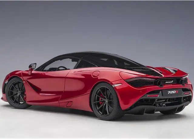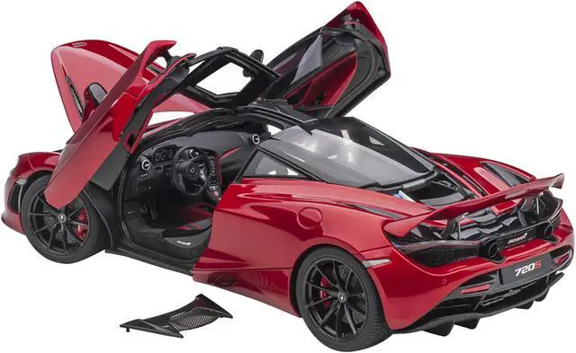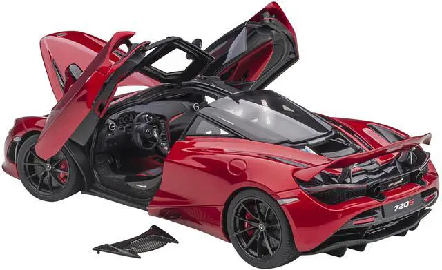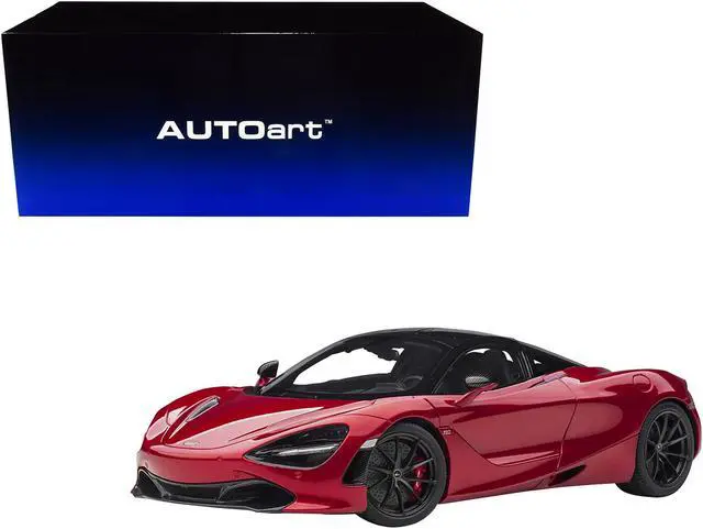 Brand new 1/18 scale car model of McLaren 720S Memphis Red Metallic with Black Top and Carbon Accents model car by Autoart.