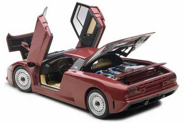 Brand new 1:18 scale diecast car model of Bugatti EB110 GT Dark Red die cast car model by Autoart. Brand new box. Rubber tires. Has steerable wheels. Detailed interior, exterior. Dimensions approximately L- 10.5, W-4, H- 3.25 inches.