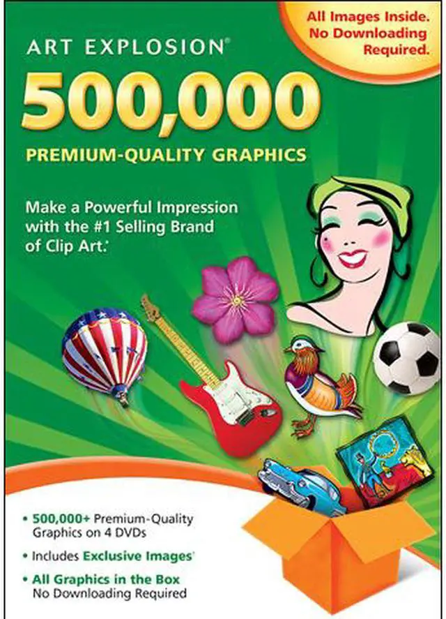 Additionally, unlike other clip art collections, Art Explosion 500,000 doesn’t require downloading or subscription memberships. Each image is easy to locate, and is compatible with virtually every desktop publishing and graphics program.