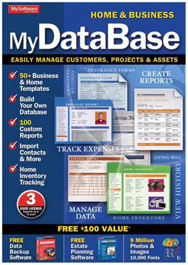 | Feature | With easy setup and installation and more than 50 pre-designed database templates for both business and home and 100 custom reports, MyDatabase gets you started fast. Manage customers, vendors, projects while tracking assets for insurance claims. Includes backup and estate planning software to ensure your data and valuables are always protected. 50+ Home & Business Database Templates Get started quickly with more than 50 built-in and customizable home and business templates – contacts, employee records, home inventory, and more. Build Your Own Database Simply enter a fi eld name, specify fi eld type, arrange the fi elds and personalize with your company logo. It's that easy! 100+ Custom Reports Make better business decisions with a broad range of reports – expense, accounts receivable and profi t, address lists, value of assets, inventory, and more. Home Inventory Tracking Organize and track your possessions. With MyDatabase you can create a detailed record of all your valuables in one place, which helps you expedite your insurance claims, makes it easy to move, and keeps you prepared for any emergency. Built-in Database Sharing Access the same database simultaneously. Your team can view, update, and edit the fi le easily. No costly network specialist or consultant required. Send Personalized Emails Keep your customers informed with personalized emails. MyDatabase pulls your email contact list directly from your database. What's New FREE $100 Value in the Box Database Backup Software – automatically backup and protect your critical data Estate Planning Software – create wills, trusts, power of attorney, and more 9 Million Photos & Images, 10,000 Fonts – customize your forms 17 New Built-in & Customizable Home & Business Templates Templates to organize and track offi ce equipment, electronics, jewelry, medical, sports and recreation, vehicles, and more. |