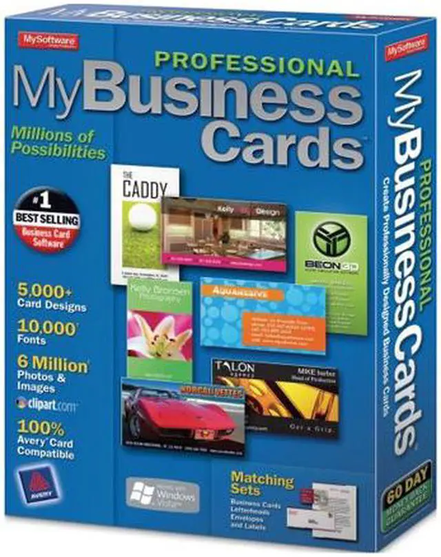 | Feature | Millions of business card combinations Vertical and horizontal designs Over 5,000 background designs from classic to contemporary Matching sets of business cards, letterheads, envelopes, & labels Supports 8 & 10 cards per sheet 6 million photos and images Supports graphics in EPS, PCX, WMF, PBP, TIFF, TGA, DIB, WPG, IMG, JPEG and RLE formats Image adjustment tools Custom design tools Adjust-to-fit background feature Over 10,000 fonts Text and graphic rotation Text gradient, shadowing and warping Professional color palette Adjustable character spacing Save as a jpeg file and attach to emails Built-in address book allows you to store multiple profile data Spell checker Printer alignment tools Print to laser or inkjet printers Works with Avery, PaperDirect and more Add business cards to email |