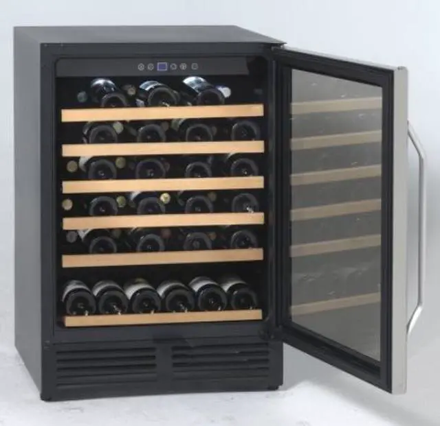 Featuring five vinyl-coated roll-out shelves with wooden fronts, and one short shelf, the 24” wide Wine Cooler provides plenty of space to store up to 50 bottles of wine, and allows you to easily access your stock before the next uncorking.