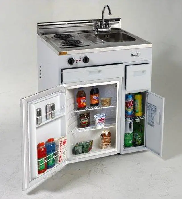 Compact Kitchen: Stainless Steel Sink with Chrome Faucets, Stainless Steel Countertop, Two Electric Heating Elements (500/900 Watts), Power Indicator Lights, Seperate Storage Area with Door, Two Drawers, Integrated Backsplash, Refrigerator: 2.2 CF All Refrigerator, Reversible Door - Left or Right Swing, Two Adjustable/Removable Slide-Out Shelves, Door Bins for Additional Storage, Full Range Temperature Control, Integrated Door Handle, Energy Star, unit