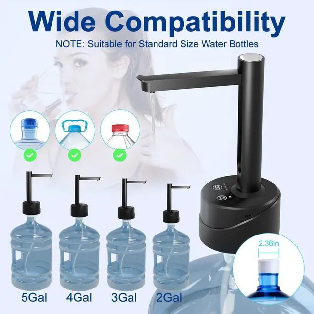 Compatible Bottle: Most 2, 3, 4, and 5-gallon water bottles and other standard-sized containers