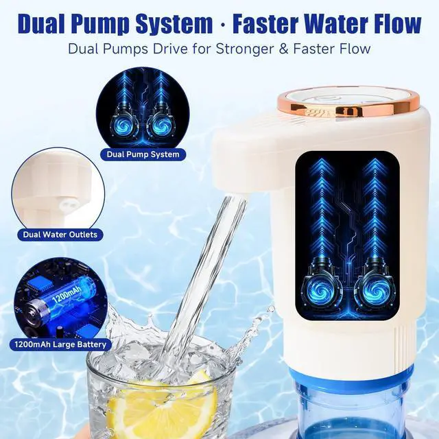 Dual Pump Water Dispenser for 5 Gallon Bottle, Electric Water Bottle Pump with Water Jug Cap, Powerful Flow, USB Rechargeable Automatic for Home, Office, Camping-Beige
