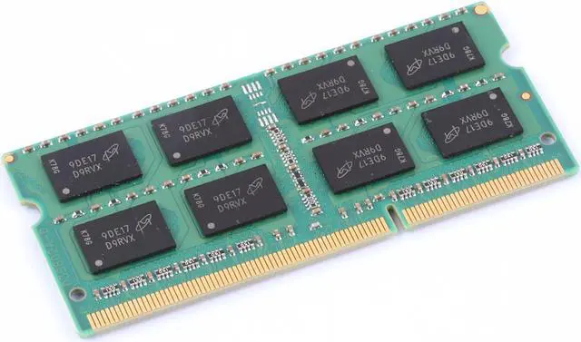 SODIMMs are smaller and thinner than regular DIMMs, and the 204-pin SODIMM PCBs are always ~2.6 inches long and are usually around 1.18 inches high (though the heights can vary slightly). They consist of a number of memory components (usually black) that are attached to a printed circuit board (usually green). The number of memory components on a 204-pin SODIMM's printed circuit board (PCB) can vary, but the PCB will always have 102 pins on the front and the back both, for a total of 204 pins. The gold pins on the bottom of the SODIMM provide the connection between the memory module and the memory socket.
