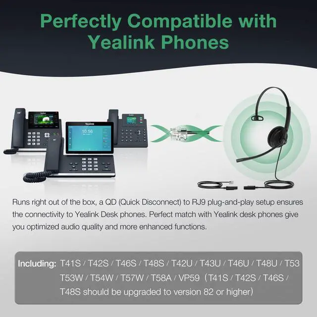 - Runs right out of the box, a QD (Quick Disconnect) to RJ9 plug-and-play setup ensures the connectivity to Yealink Desk phones. Perfect match with Yealink desk phones give you optimized audio quality and more enhanced functions.