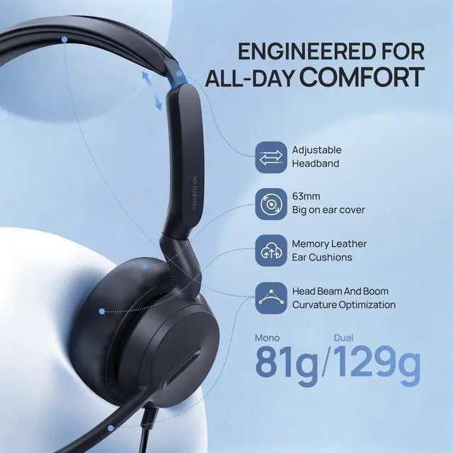 All Day Comfort with Ergonomic Design The ultra-lightweight materials combined with bio-mimetic protein-based leather ear cushions and improved ergonomic design, including an adjustable headband and optimized ear cushion size, provide exceptional comfort. Engineered for long conference calls and all-day use without fatigue.