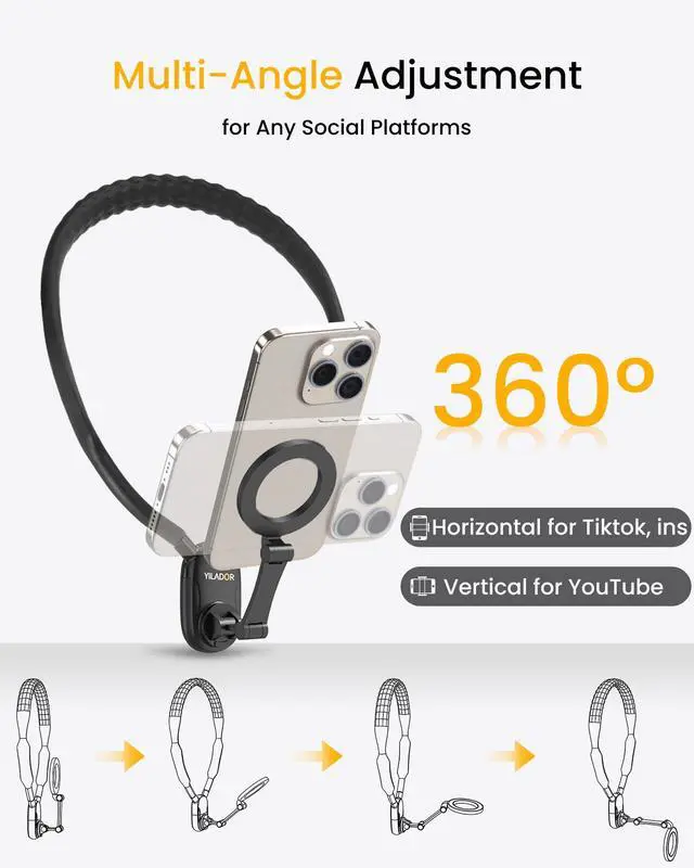 Yes, it can. The mount allows for 360° angle adjustments, enabling you to easily switch between portrait and landscape orientations, as well as adjust the forward and backward distance to suit your filming needs.