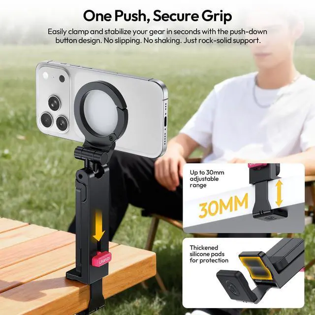 One-Click Secure Clamp This airplane travel essential clips tight on edges (under 3cm thick) think airplane tray tables or airport lounge desks. Its one-click clamp + strong magnet keeps your phone steady: binge shows mid-flight, edit travel vlogs during layovers, no sore arms from holding devices.