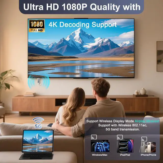 Wireless HDMI Display Dongle Adapter for TV Miracast Dongle, DLNA, AirPlay - Plug & Play Video/Audio, HDMI Screen Mirroring Adapter Extender for iOS/Android/Windows/Mac to HDTV/Monitor/Projector