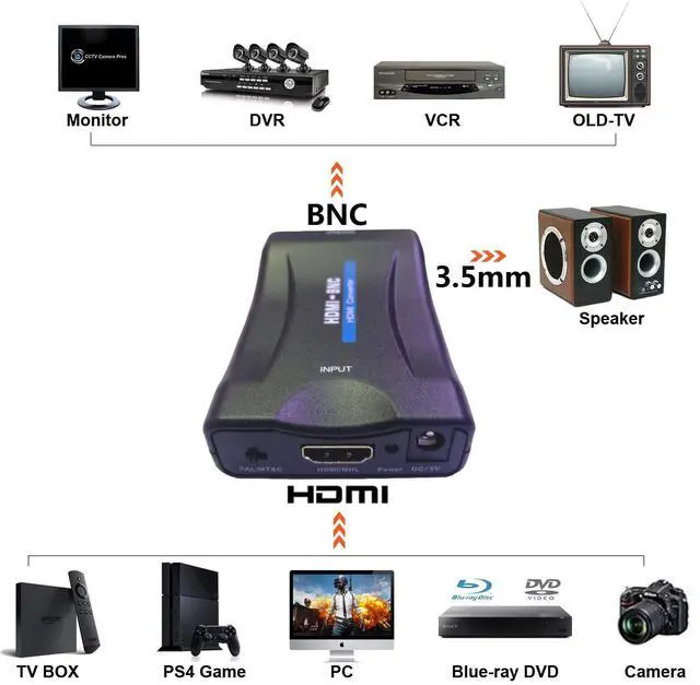 HDMI to BNC video converter is an adapter for full HDMI equipment sources which are from TV box , game console ( PS3 / PS4 / WII U / XBOX One 360 ), ordinary cameras , Blue-ray DVD Player or high-definition player etc. transforming into BNC CVBS output or converting the audio and video signals of NTSC / PAL format to 480P / 576I analog signals which are used on normal old TV / Monitor / VCR / DVR / VHS etc.devices . It widly applicate to KTV equipment or meeting / presentation that converts full HD camera signals to the video recording capture card of computer for remote control( HTTP ) or web conferencing meeting