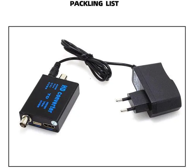 Specifications: Power: DC 5V-20V Working Current: 150mAh Consumption: =2Wat Signal input: AHD/TVI/CVI/CVBS(1080P/960P/720P) Signal output: HDMI / VGA / CVBS(1080P/720P) Dimension: 66*53*21mm Net Weight: 73g