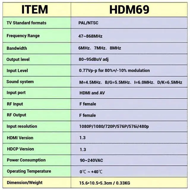 Item Type: HD Multimedia Interface AV to RF Modulator