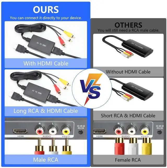 Male RCA to HDMI Converter for Smart TV - Converts analog composite rca input to HDMI 1080p output,displayed on HD TV/ Moniter.