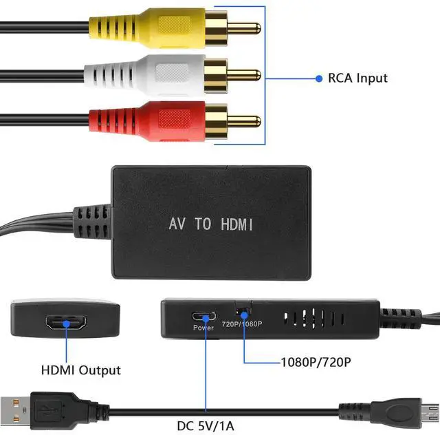 - Package: 1x RCA to HDMI converter(with rca cable), 1x HDMI cable, and 1x USB power cable, 1x 5V 1A power adapter,
