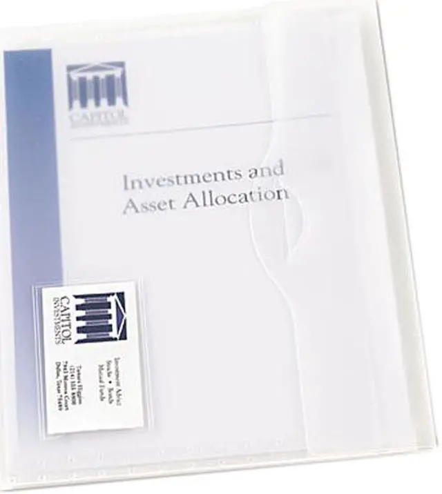 Document Wallet features a business card pocket on front. Flap easily opens and closes securely with die-cut closure. Wallet is made of a translucent, matte finish poly material that is durable and stylish. Holds up to 50 pages.