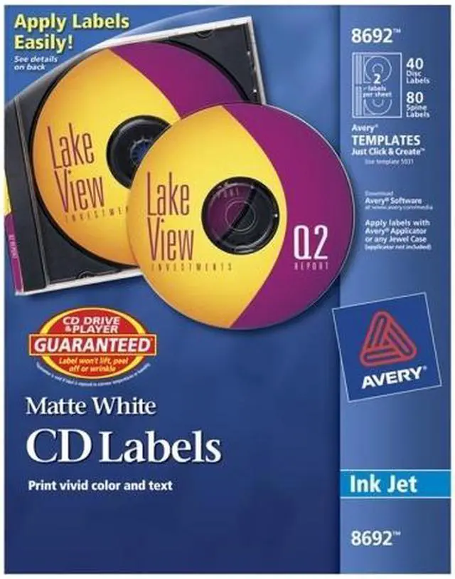 These CD labels allow you to create custom-made, professional-looking labels with a printed appearance for your business. Labels feature a unique, patented design which centers labels using a standard jewel case, and they're guaranteed not to lift, peel off or wrinkle. With free designs, QR codes, and templates from Avery