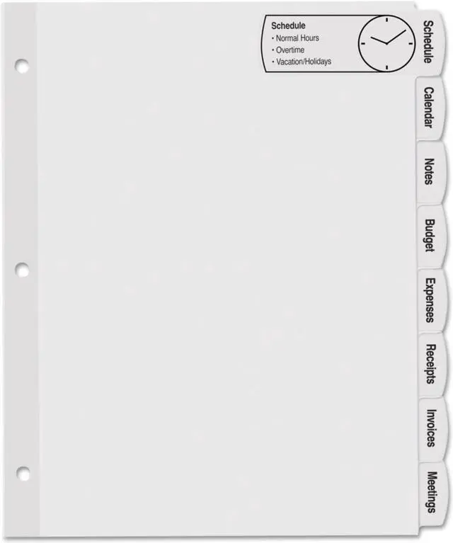 - Large labels extend from tabs onto divider bodies for more information section contents logos or designs.