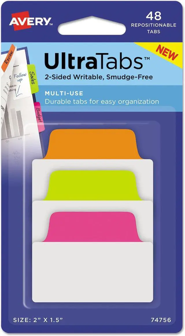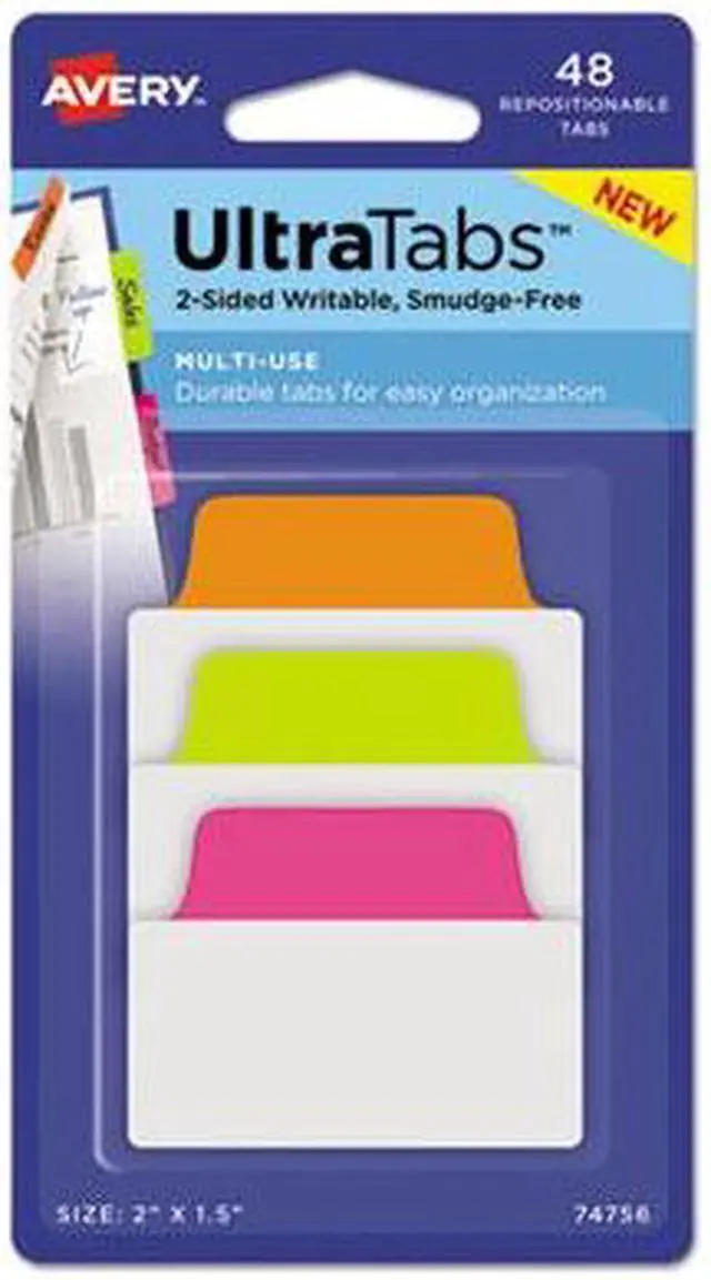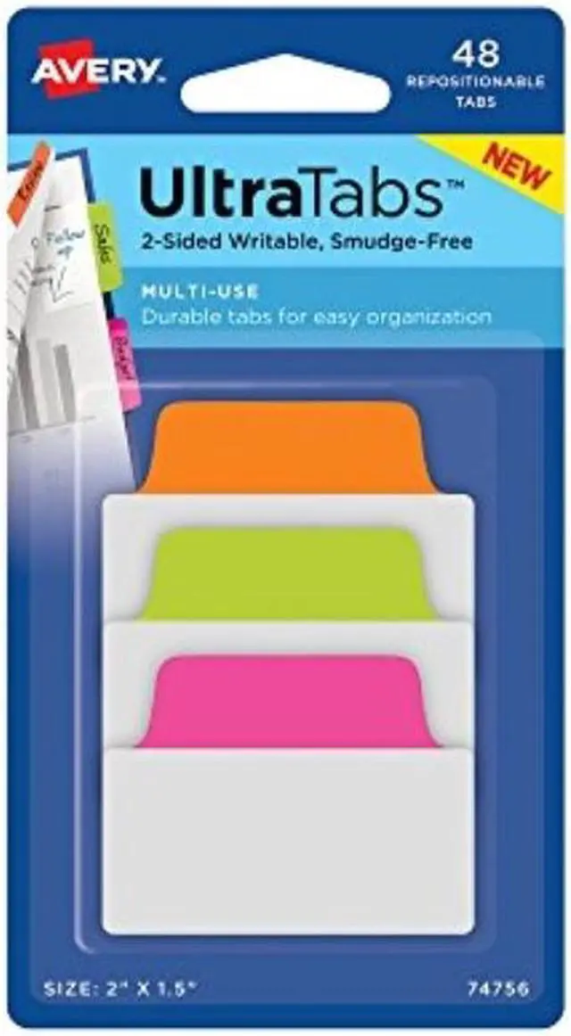 Avery Multiuse Ultra Tabs are sturdy page tabs with stylish designs that make indexing, marking and referencing documents quick, easy and fun. The page tabs are writeable on both sides and the adhesive bodies are clear so you can see text underneath. Write on the tabs with most pens, pencils, markers and highlighters, and they're smudge-free*. The durable tabs stick securely and strong enough to turn pages, yet remove easily without leaving residue or lifting ink. Perfect for home organization; use these sticky tabs as page flags in magazines, bible tabs for passages or index tabs in cookbooks. Students, teachers, and administrators will find it easy to highlight textbooks and notes without marking the pages. At the office, make quick and easy sticky notes in your weekly or monthly planner and mark items in a report or presentation for referencing, follow up or signatures. The pack of 48 neon color tabs includes 16 pink, 16 green and 16 orange 2" x 1.5" tabs. *Ink dry times may vary. Tab may lift some inks. Test before applying.