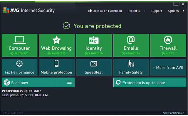 DETECTS AND STOPS VIRUSES, THREATS, AND MALWAREAVG Internet Security 2014 stops viruses before they get to your PC. It checks your files before you open them, your Facebook links before your click, your email before it gets to you, and your websites before you visit them. All of those are thanks to a host of tools and technology, including AntiVirus, AntiMalware (AVG Resident Shield), AVG Anti-Rootkit, AVG Email Scanner, AVG Protective Cloud Technology, AVG Community Protection Network, AVG LinkScanner Surf-Shield, and AVG Social Networking Protection.