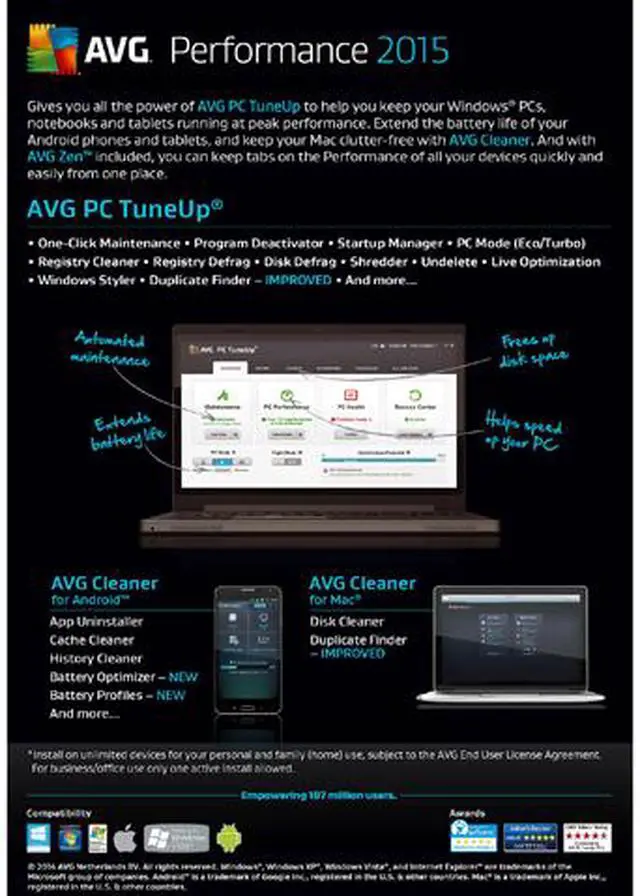 Gives you all the power of AVG PC TuneUp to help you keep your Windows PCs, notebooks, and tablets running at peak performance. Extended the battery life of your Android phones and tablets, and keep your Mac clutter-free with AVG Cleaner. And with AVG Zen included, you can keep tabs on the performance of all your devices quickly and easily from one place.