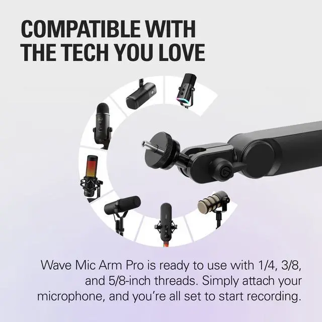 Low Profile: Wave Mic Arm Pro features superior suspension technology for ultra-smooth, silent adjustments; Its compatible with a wide range of mic brands and models, including Sennheiser, Audio-Technica, HyperX, Rode, Shure, Neumann, and many more