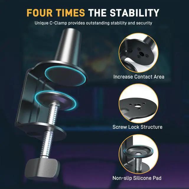 The upgraded C-clamps provide a firm attachment to your table (fits 0.8--2.2in thickness), never worry about the arm shaking.