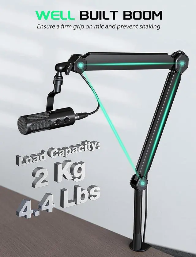 This sturdy mic boom arm is made of heavy-duty metal, which can withstand weight capacity of within 2kg (4.4 lbs) stably and is extremely durable. Also, it reduces slight vibration of the microphone and obtains clearer recording sound quality.