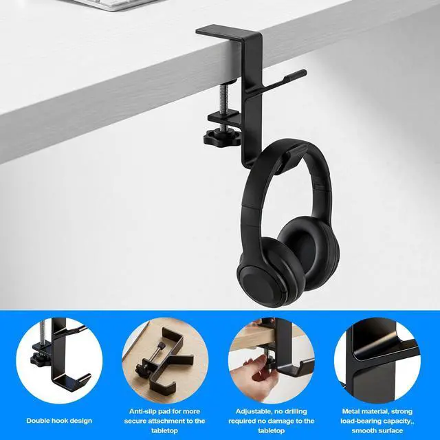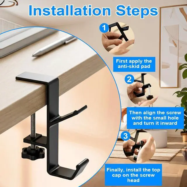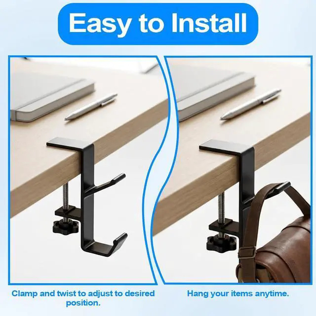 Adjustable Universal Clamp Fits Various SurfacesThis headphone hanger features an adjustable screw clamp that easily accommodates tabletops, shelves, or monitor edges of different thicknesses (from thin to thick). No glue or drilling requiredit installs securely to instantly declutter your desk and achieve a clean,organized layout.