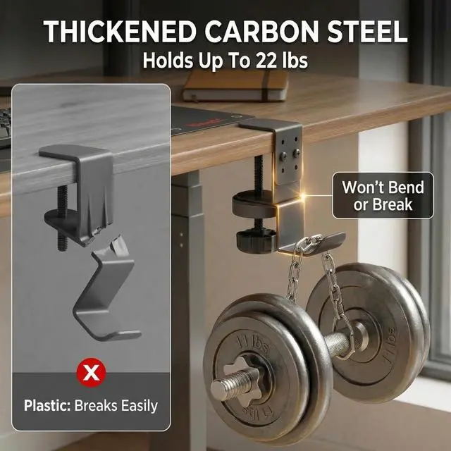 CARBON STEEL FOR HEAVY LOADS Unlike fragile plastic hangers, this thickened cold-rolled carbon steel holder supports up to 22lbs. It securely holds heavy gaming headsets and full backpacks without bending, deformation, or breaking under pressure