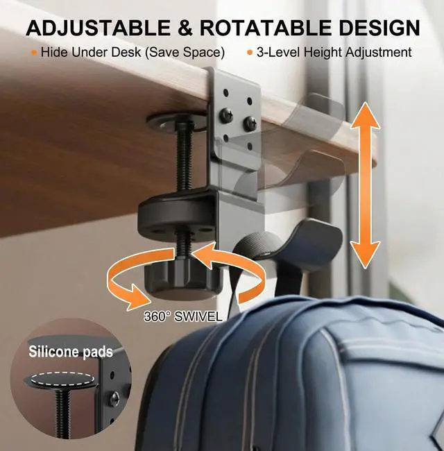 360° ROTATING & ADJUSTABLE Features a 360° swivel to swing the hook under the desk for storage or out for easy access. With 3-level height adjustment, it accommodates various item sizes, keeping your gaming setup or workstation organized and clutter-free