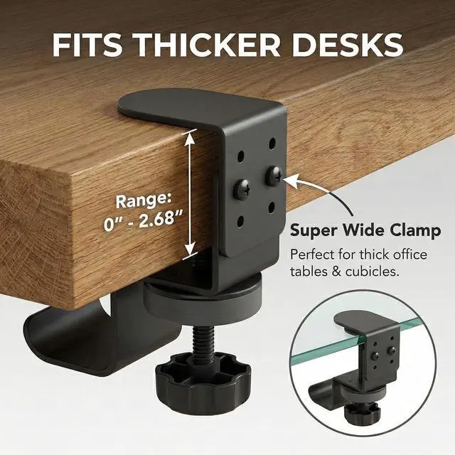 FITS THICKER DESKS UP TO 2.68" Designed for versatility, the adjustable clamp fits table edges from 0 to 2.68 inches thick. The secure nut fixation system provides a stable grip on thick wooden or glass desks without requiring adhesives or drilling