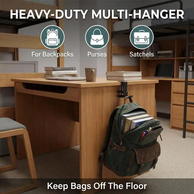 MULTI-PURPOSE ORGANIZER Ideal for gamers and students, this heavy-duty hook efficiently stores headphones, school bags, purses, and umbrellas. A practical, space-saving accessory for decluttering dorm rooms, offices, and home PC setups
