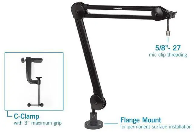 The Samson MBA38 Microphone Boom Arm is a highly-adjustable microphone desktop stand perfect for any radio, podcast, broadcast, or streaming setup. The MBA38 provides 38 of horizontal/vertical arm reach and gives users flexibility to achieve optimal microphone placement. The silent rotating design features internal springs that allow for quiet and effortless positioning that eliminates excess noise in the recording environment. With two mounting options included, the MBA38 can be attached to a table or desk with the C-clamp mount or more permanently fixed to a surface with the flange mount. The MBA38 has a durable steel construction that supports microphones weighing up to 5 lb. (2. 3kg) and has a 5/8-27 mic clip threading for simple microphone integration.