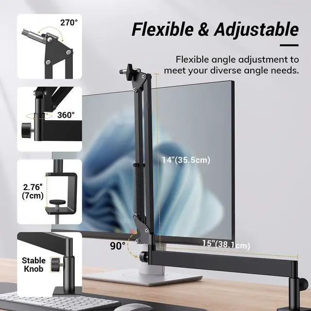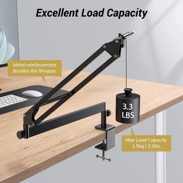 The T20LP boom arm's metal clamp securely supports desks up to 2.76''(7cm) thick. It features a 2.17''*1.97‘’(5.5cm*5cm) contact area with silicone pads for desk protection.