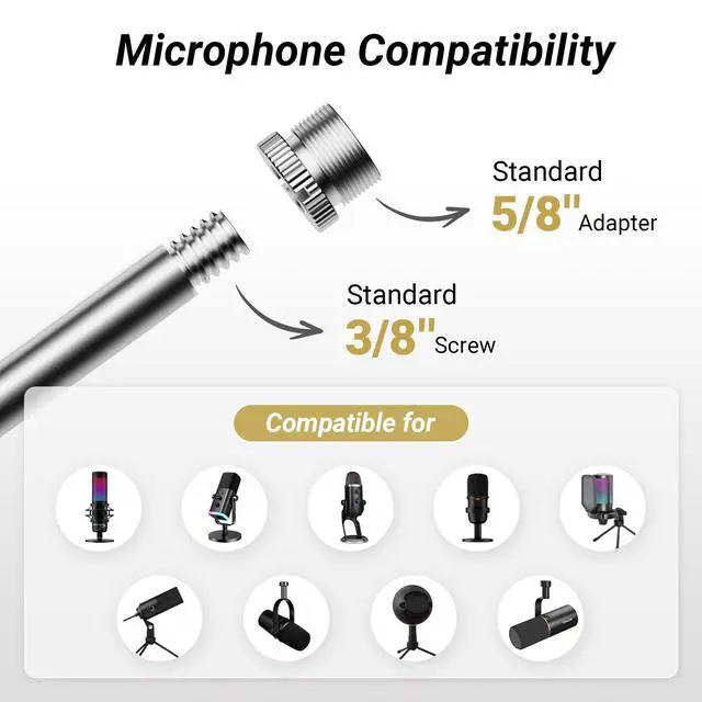 Compatible with microphones with 3/8'' or 5/8'' adapter screws, supporting most microphone models.