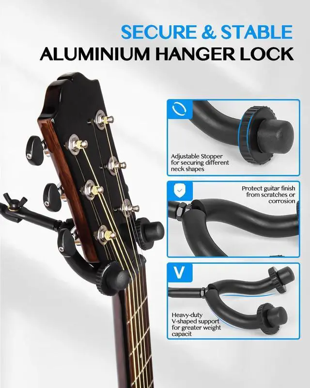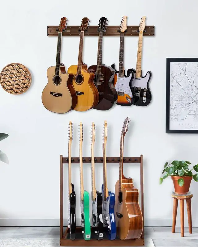 STRICH Guitar Wall Mount Hangers for Multiple Guitars, Holds 5 Guitars, Walnut Wood Grain, Strong Metal Guitar Stand Rack Bass Holder, Adjustable Instruments Display Set, SMH-05W