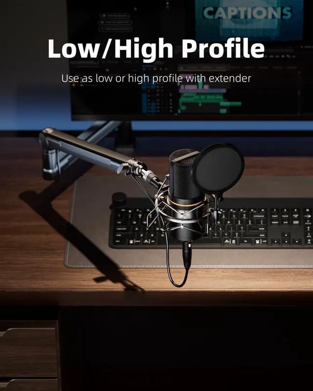 Stable&Dual-Profiles: Featuring an all-metal and integrated construction, this mic arm offers rock-solid stability for heavy duty microphones (up to 4.5LB) in both low-profile and elevated positions, perfect for gaming, streaming, or podcasting without wobbling or shaking. Includes an extension riser for adjustable height, offering both low and high profile setups to fit different recording needs.